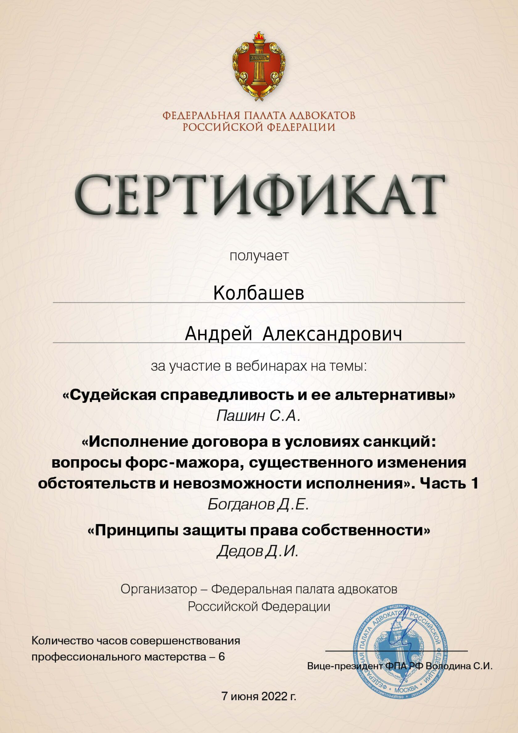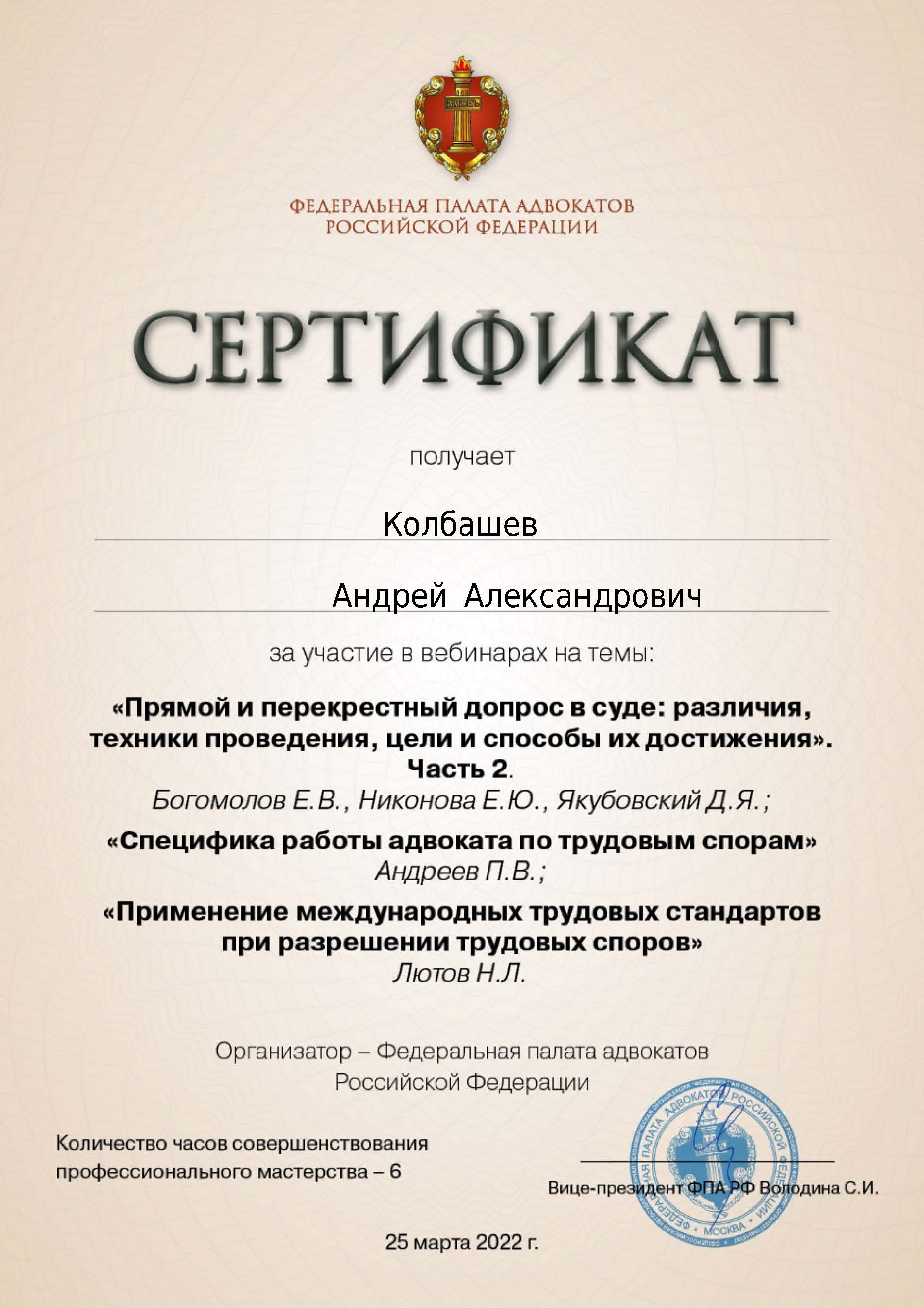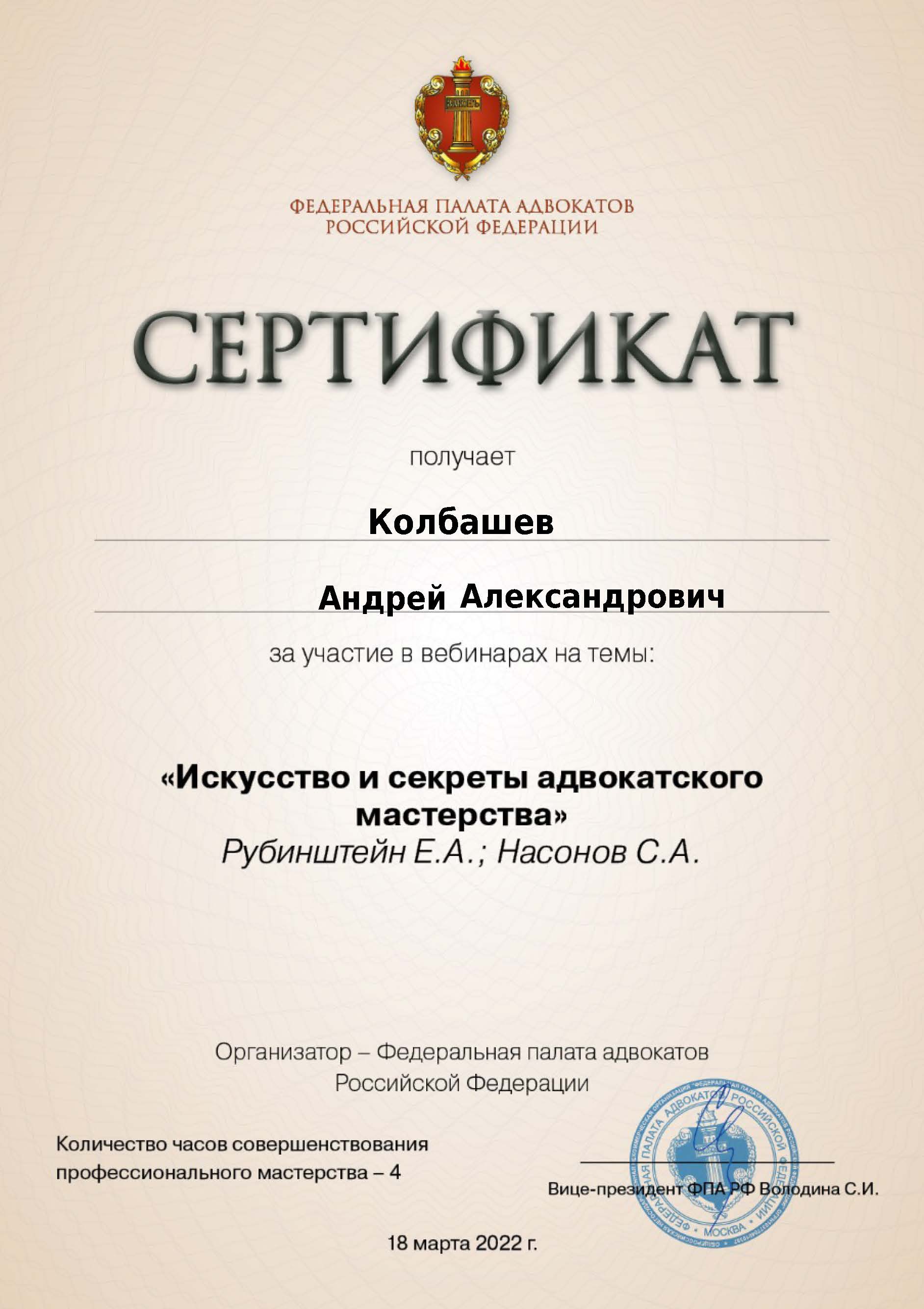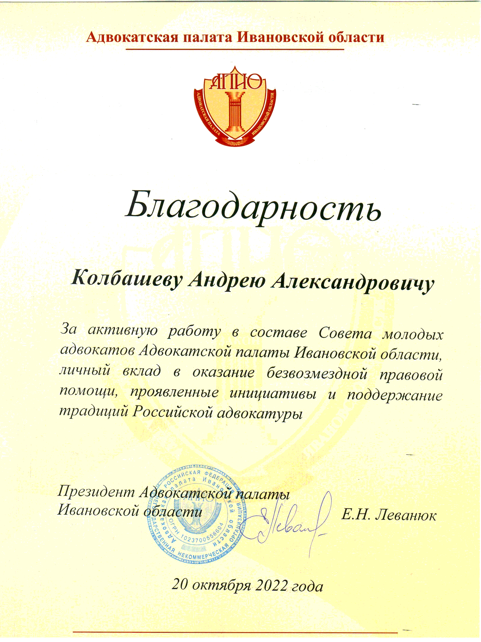 Адвокат Колбашев Андрей Александрович (регистрационный номер в реестре адвокатов 37/610) является председателем Ивановской областной коллегии адвокатов «Ваше Право». До начала адвокатской практики Андрей Александрович работал в органах прокуратуры. Предшествующий опыт работы в правоохранительных органах, понимание того, как устроена и функционирует правоохранительная система, позволяет адвокату оказывать по уголовным дела юридическую помощь высочайшего качества.